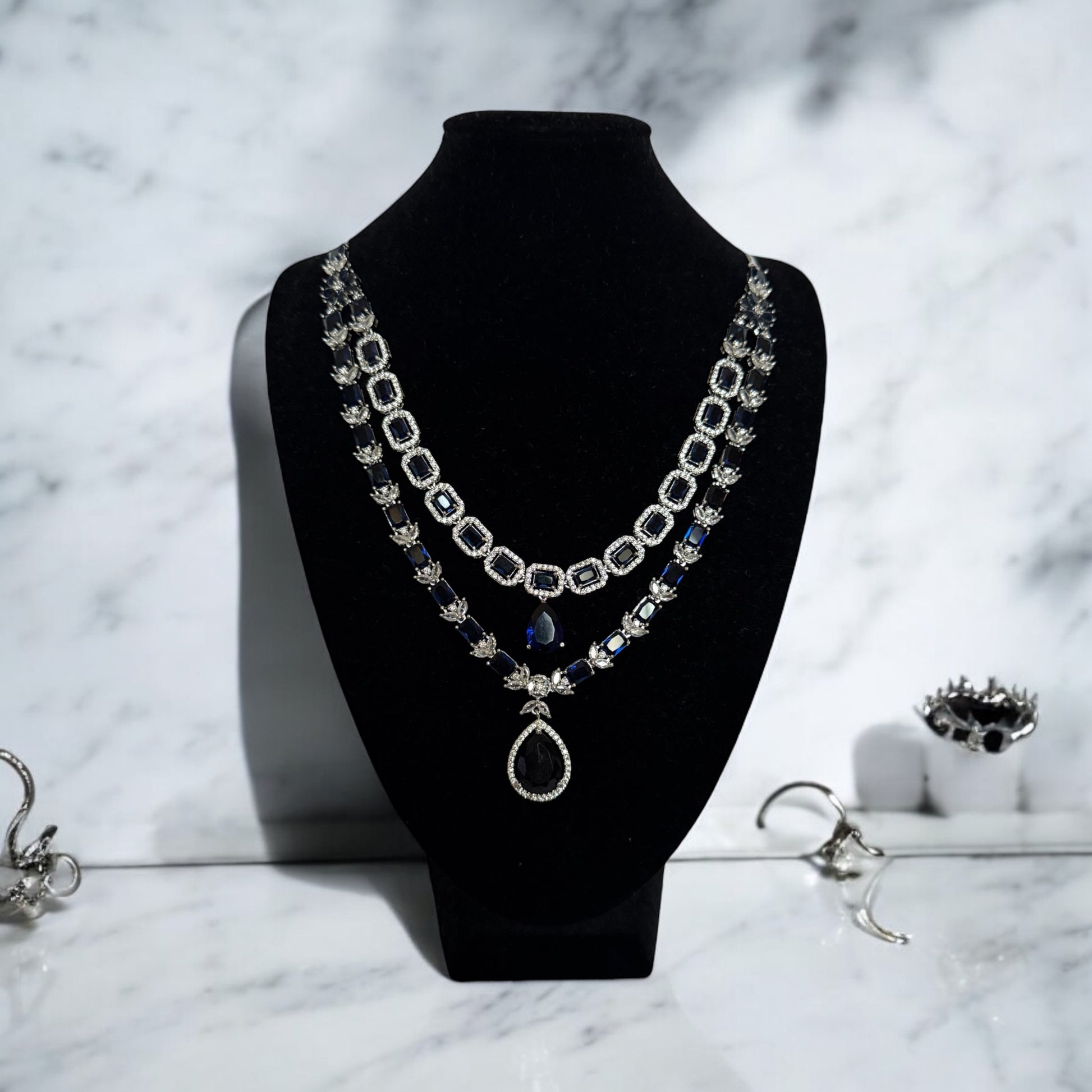Blue double layer pendant necklace set. Matching drop earrings. Silver setting