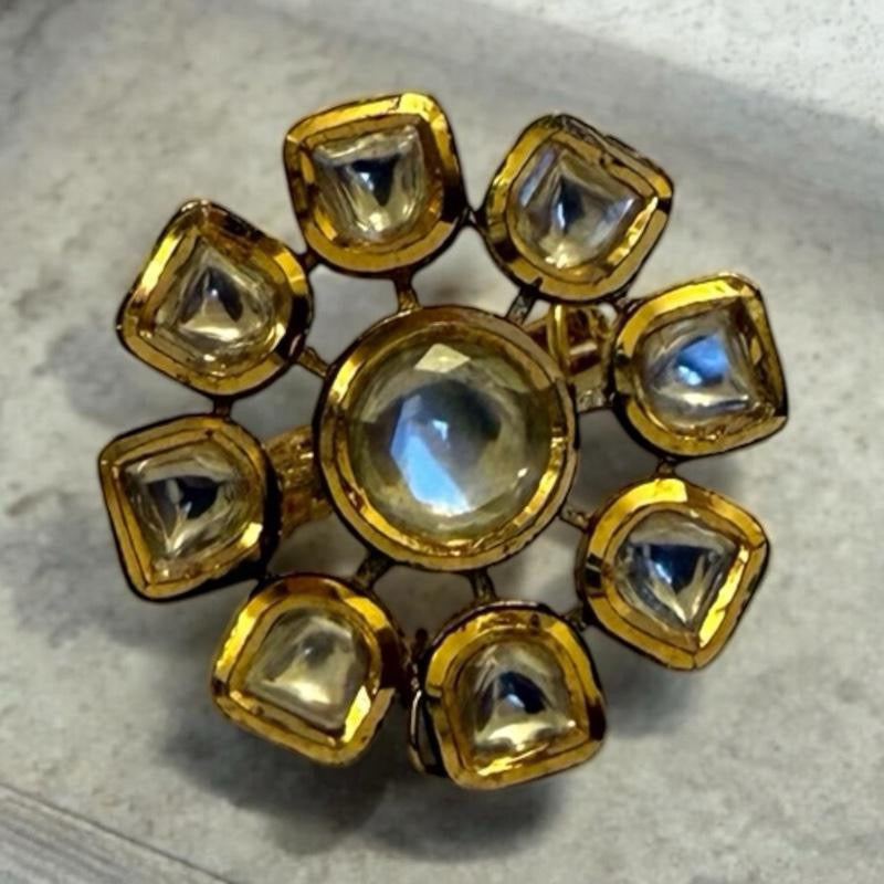 Finished in antique gold, this statement ring is adjustable and perfect for festive occasions, weddings, or styling with Indo-Western attire.