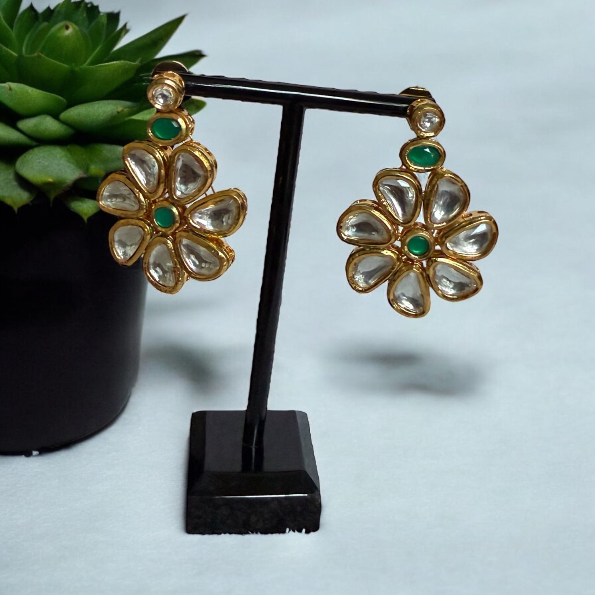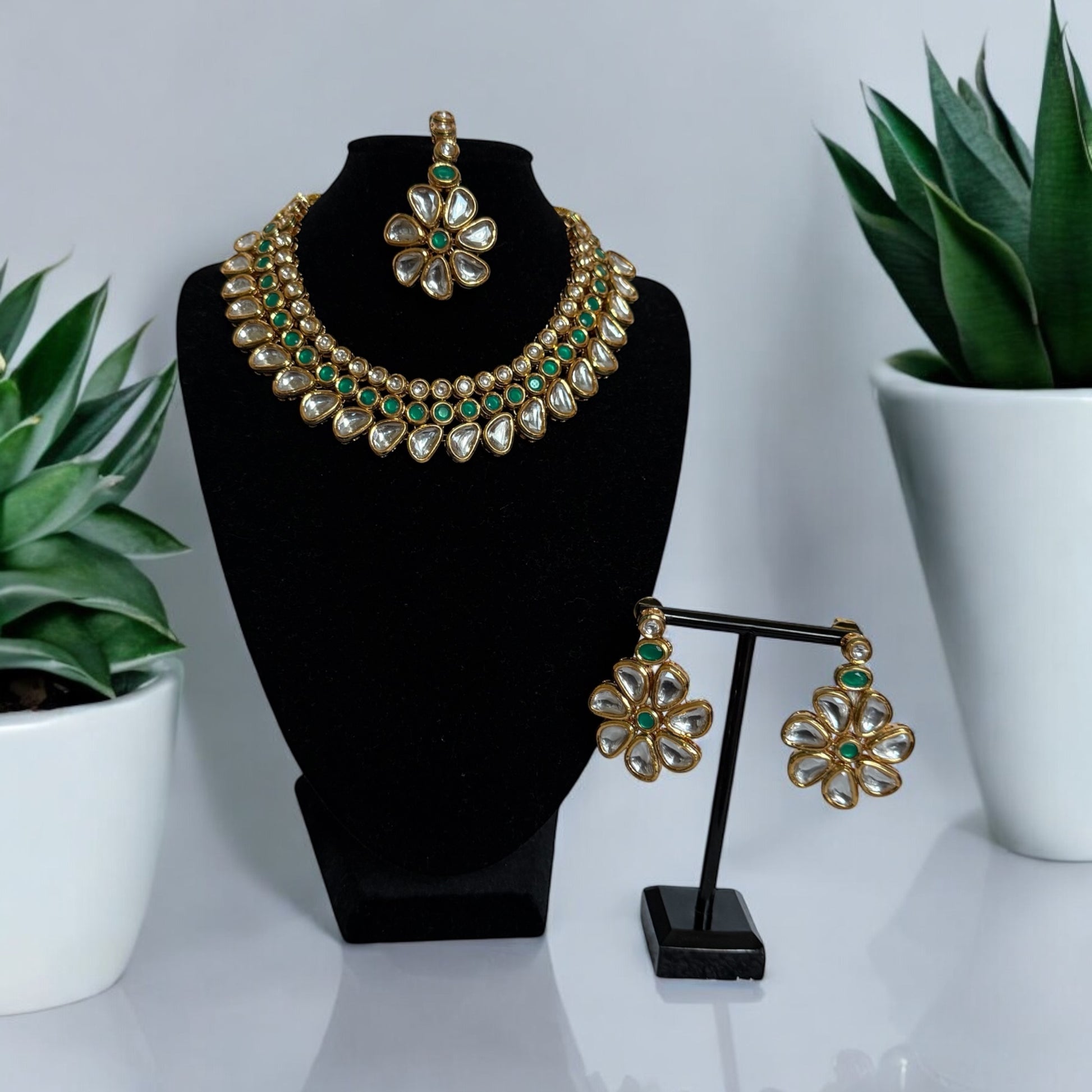 This green and clear American diamond kundan set is a beautiful and unique piece of jewelry that is sure to catch the eye. The set is made from India and features a gold plated setting that adds a touch of elegance and sophistication to the overall design. The American diamonds are carefully selected and arranged to create a stunning piece of jewelry that is perfect for any occasion.