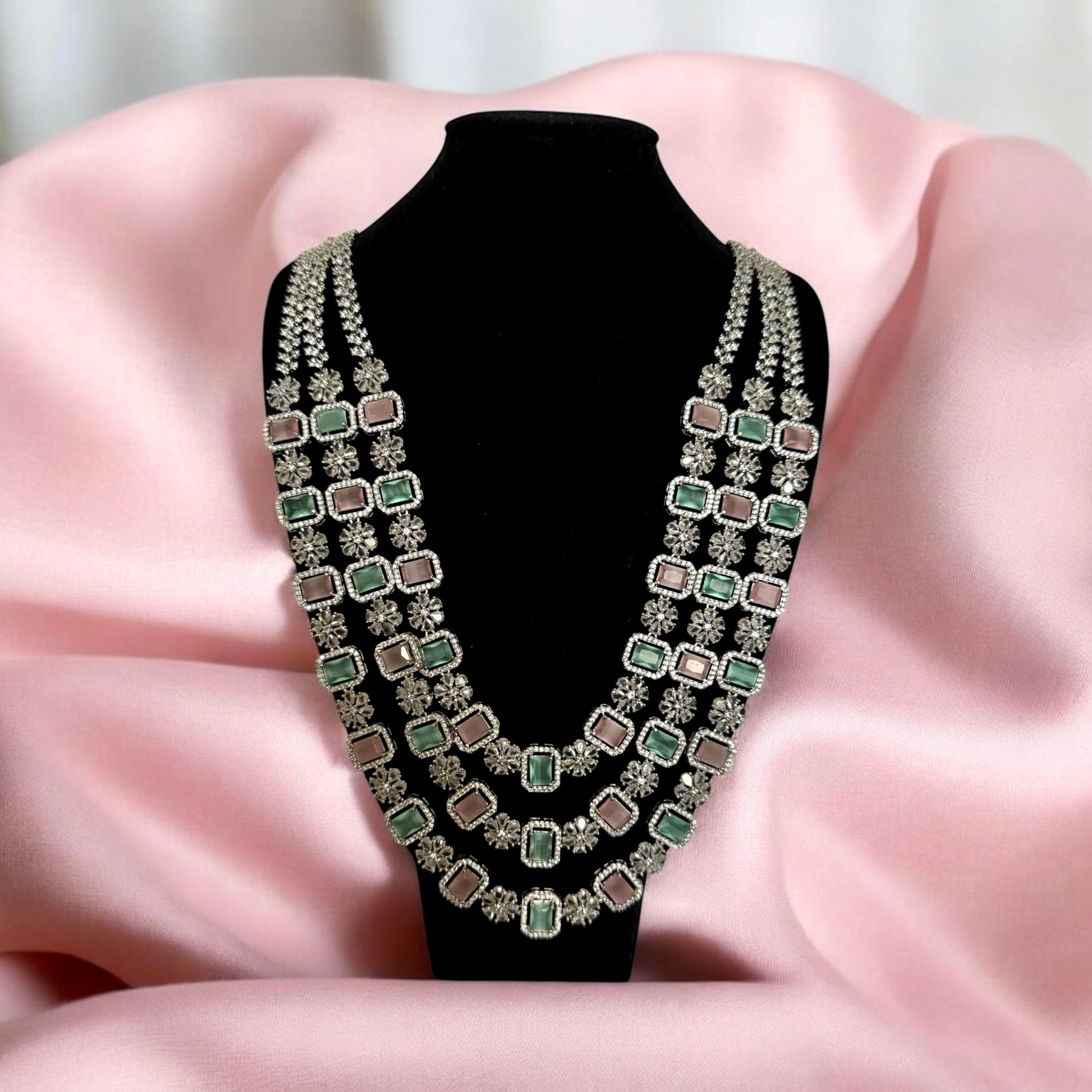 Soft, romantic, and utterly elegant—our Pastel Green & Blush Pink Triple Layer Necklace Set is the definition of modern-day royalty. Featuring three cascading rows of soft green and blush pink square-cut stones, intricately alternated with sparkling floral crystal clusters, this set is designed to enchant.