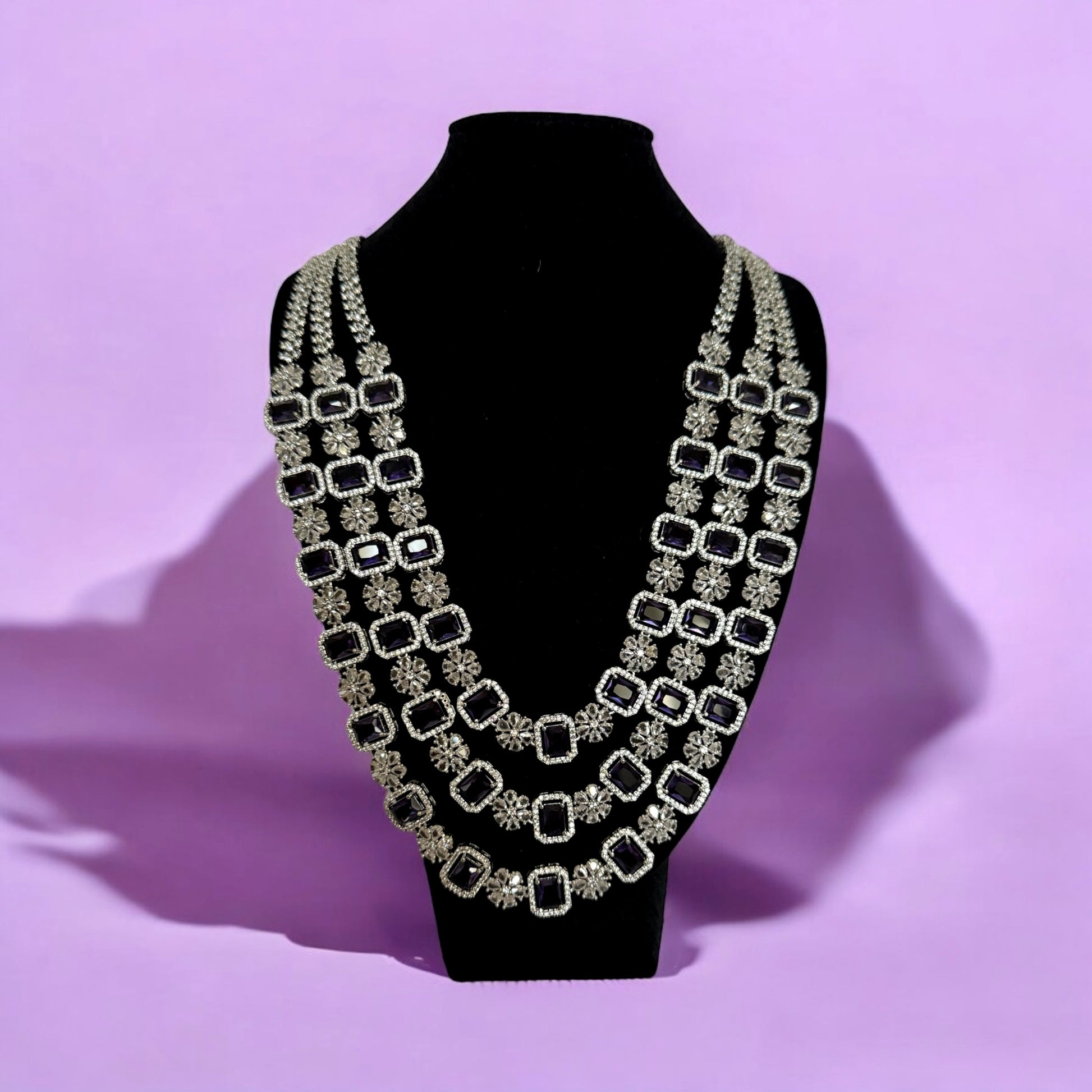 Make a royal statement with our Triple Layer Purple Crystal Necklace Set, crafted to captivate. Featuring three opulent strands of rich purple square-cut stones paired with radiant floral crystal details, this necklace set is a celebration of glamour and grace.